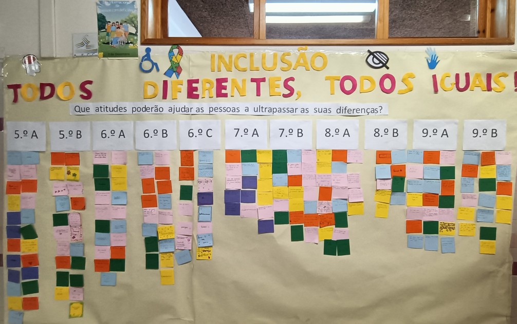 As docentes de Educação Especial, Helena Santos e Ana Carla Silva, prepararam um vídeo educativo que ajudou a compreender os desafios e as conquistas das pessoas com deficiência. Depois da visualização, os alunos refletiram sobre atitudes que promovem a inclusão e deixaram mensagens no mural “Inclusão – Todos diferentes, todos iguais!”.