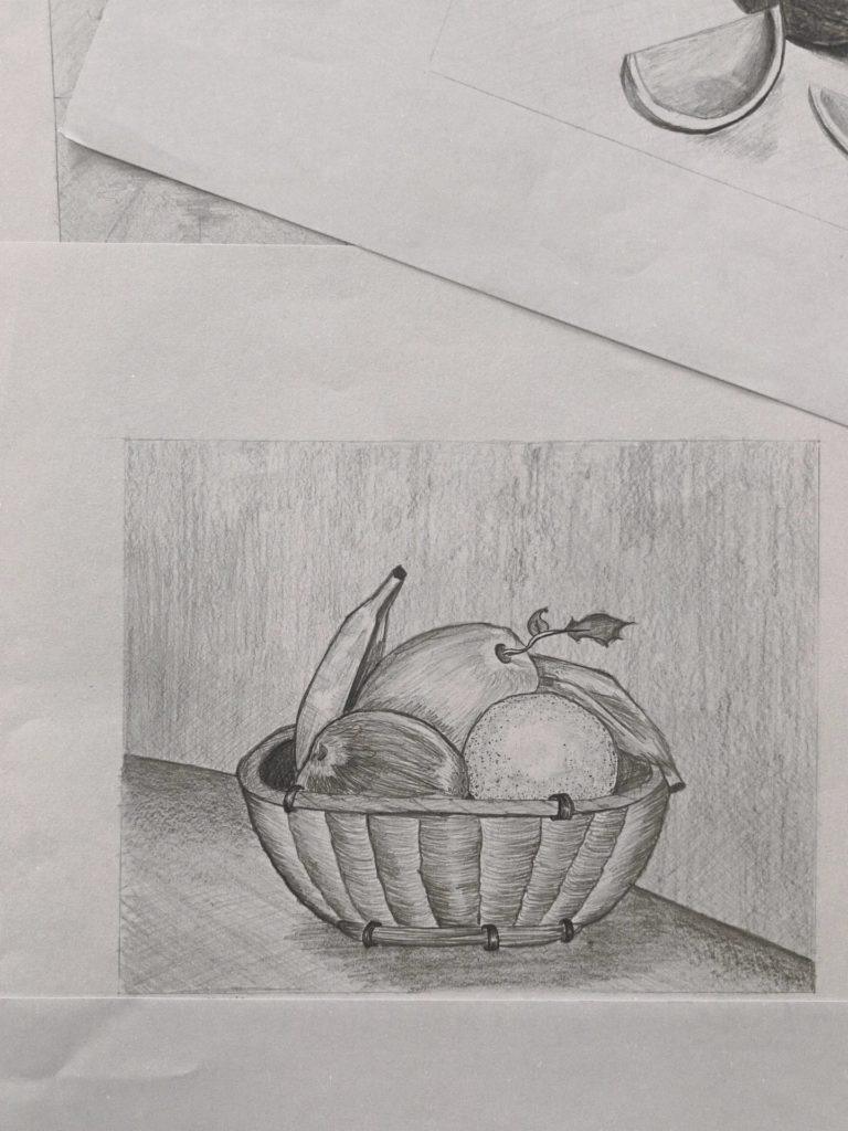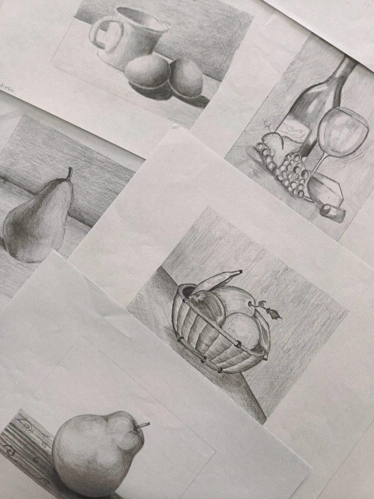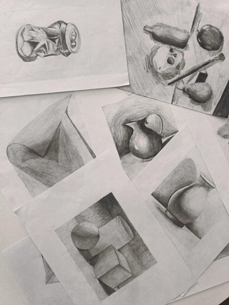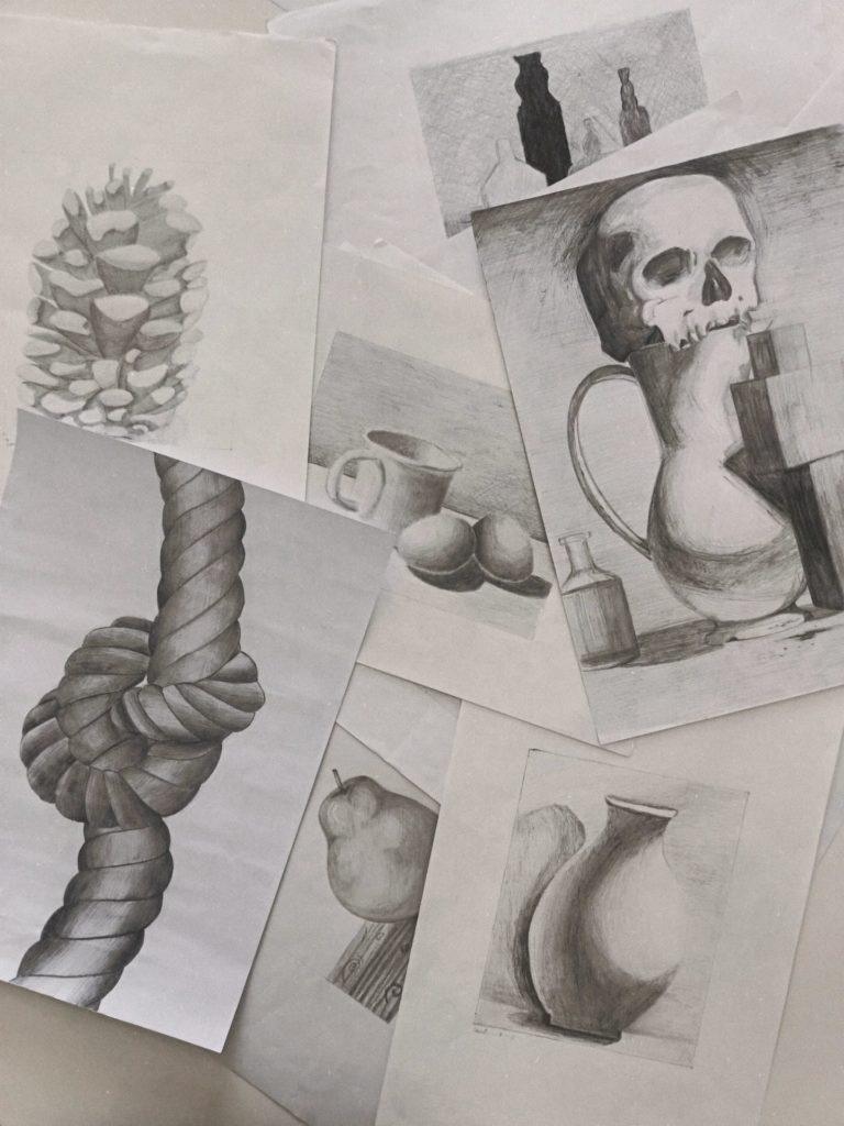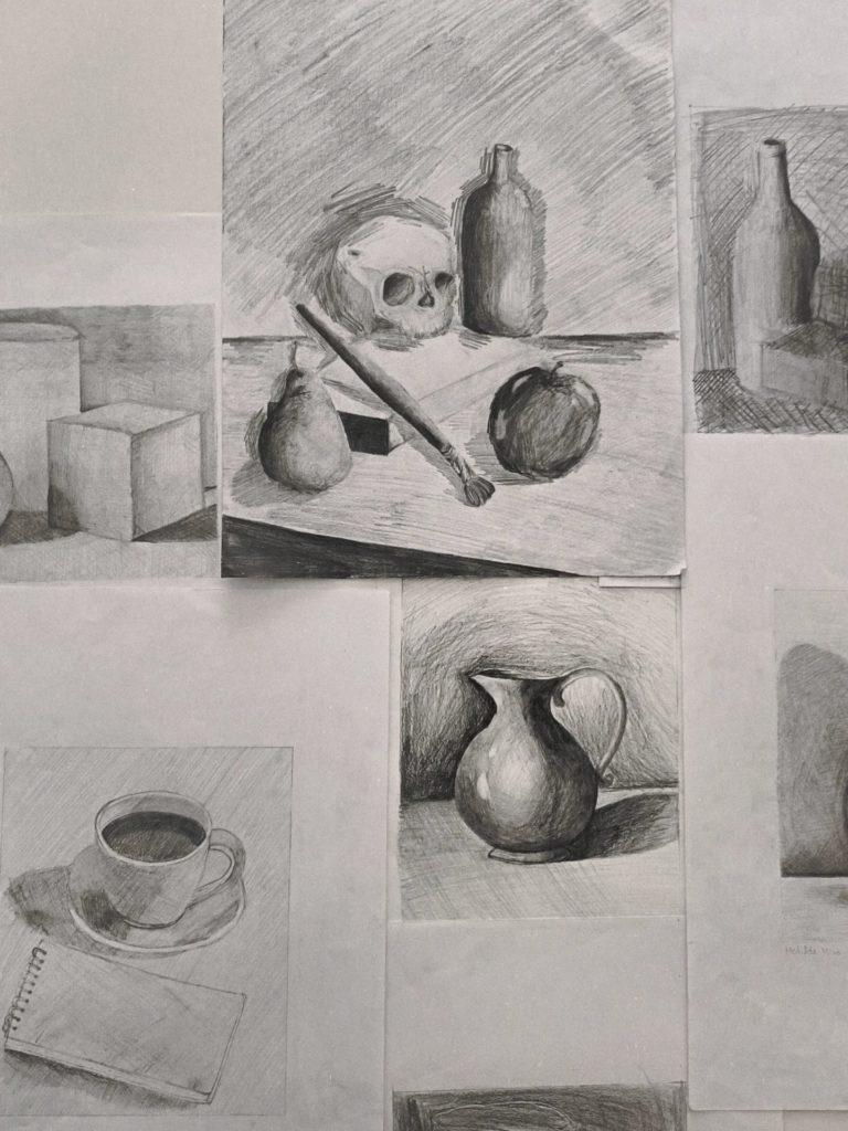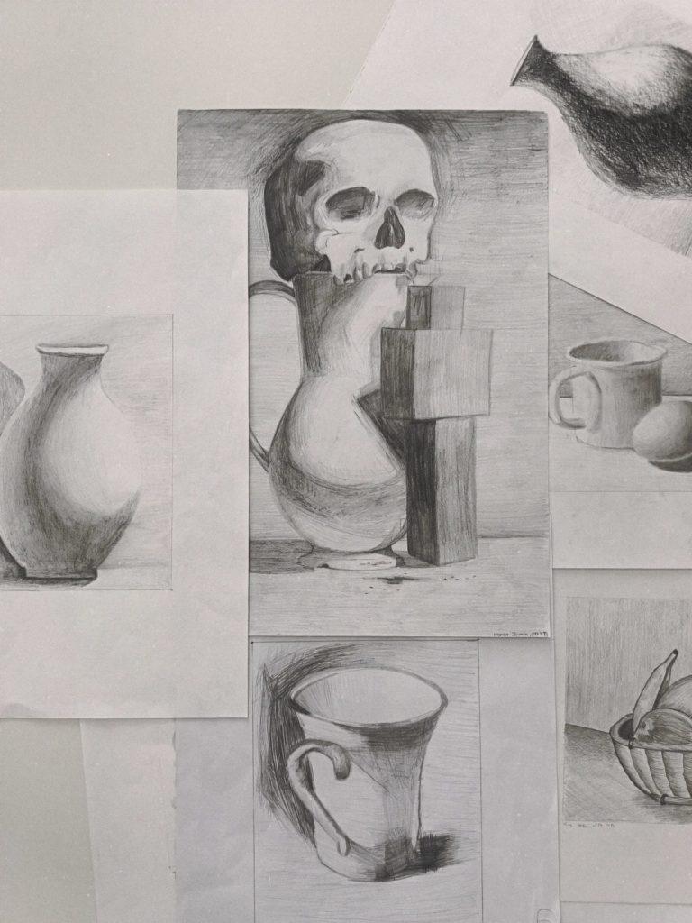 Os trabalhos apresentados resultam da observação indireta de objetos do quotidiano, refletindo não só a consolidação de competências técnicas, mas também a sensibilidade artística desenvolvida em contexto de sala de aula.